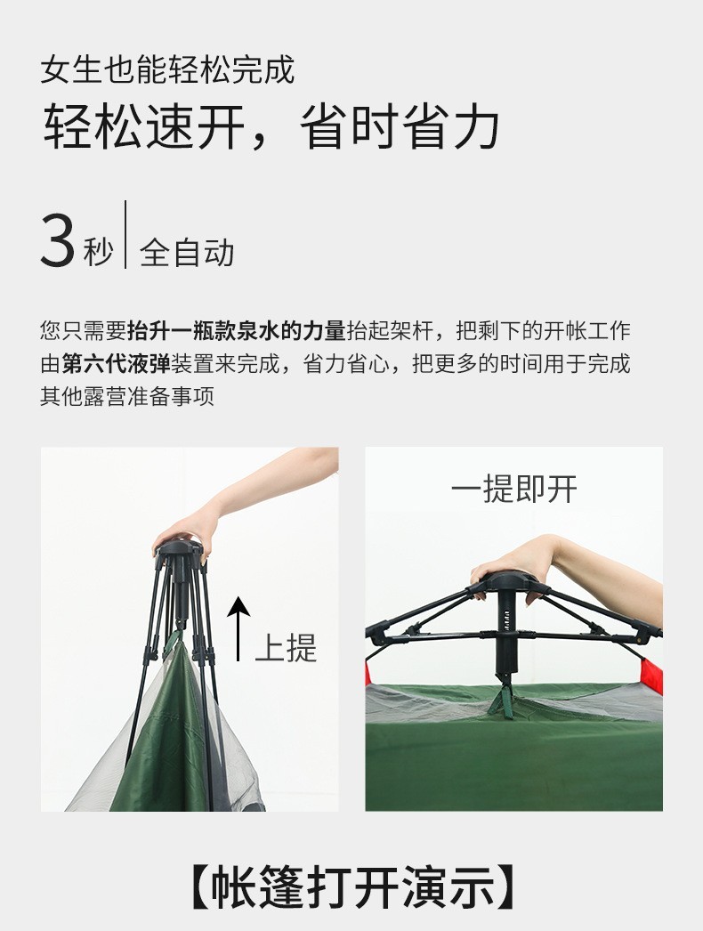 是一款市场是占有率相当高的单品,它采用多种自动调节的技术制作而成,在整体上是相当的结实耐用,并且其拉绳的柔韧性也能有效的抵抗强风。它采用液压式的伞架结构制作而成,在使用和支撑收纳上会是更方便快捷,同时内帐采用内挂式结构,双门设计加大了内帐的空气流动,保障了健康。