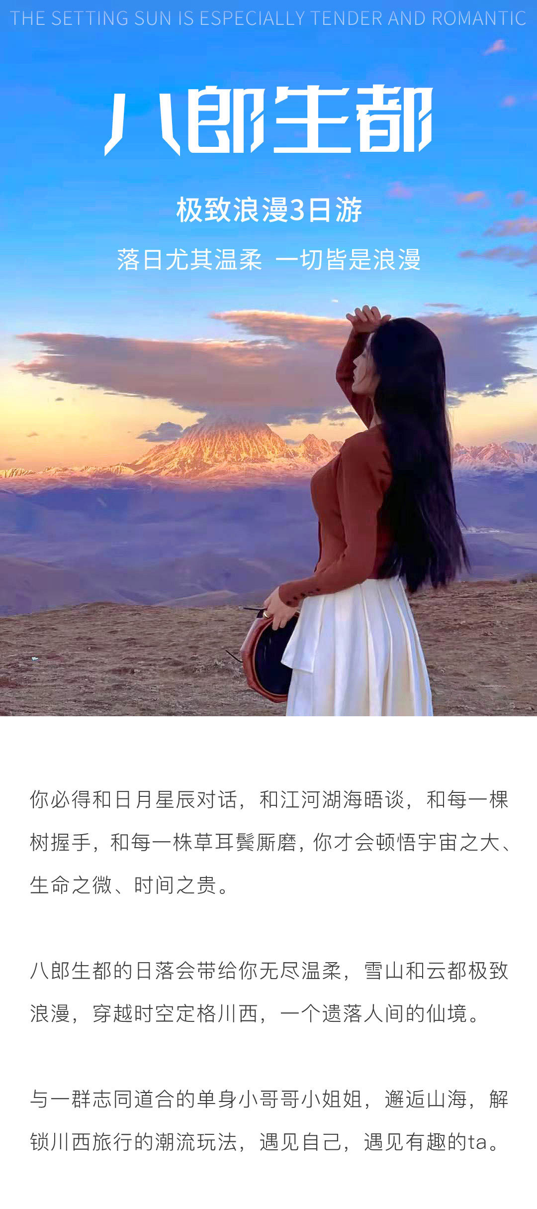 八郎生都极致浪漫3日游——落日尤其温柔,一切皆是浪漫 八郎生都+木雅大寺+塔公草原+红海子。与一群志同道合的单身小哥哥小姐姐,邂逅山海,解锁川西旅行的潮流玩法,遇见自己,遇见有趣的ta。景观亮点:日出云海,草原雪山,绝美日落; 参团客群:18-38岁未婚者; 团队人数:15人起成团,低于15人此团自动解散,所支付费用自动返回原账户; 集合解散:成都出发,成都散团; 特别告知:本产品全程纯玩无购物; 支付方式:在线支付+团上现付,详情请查看“费用包含”栏。