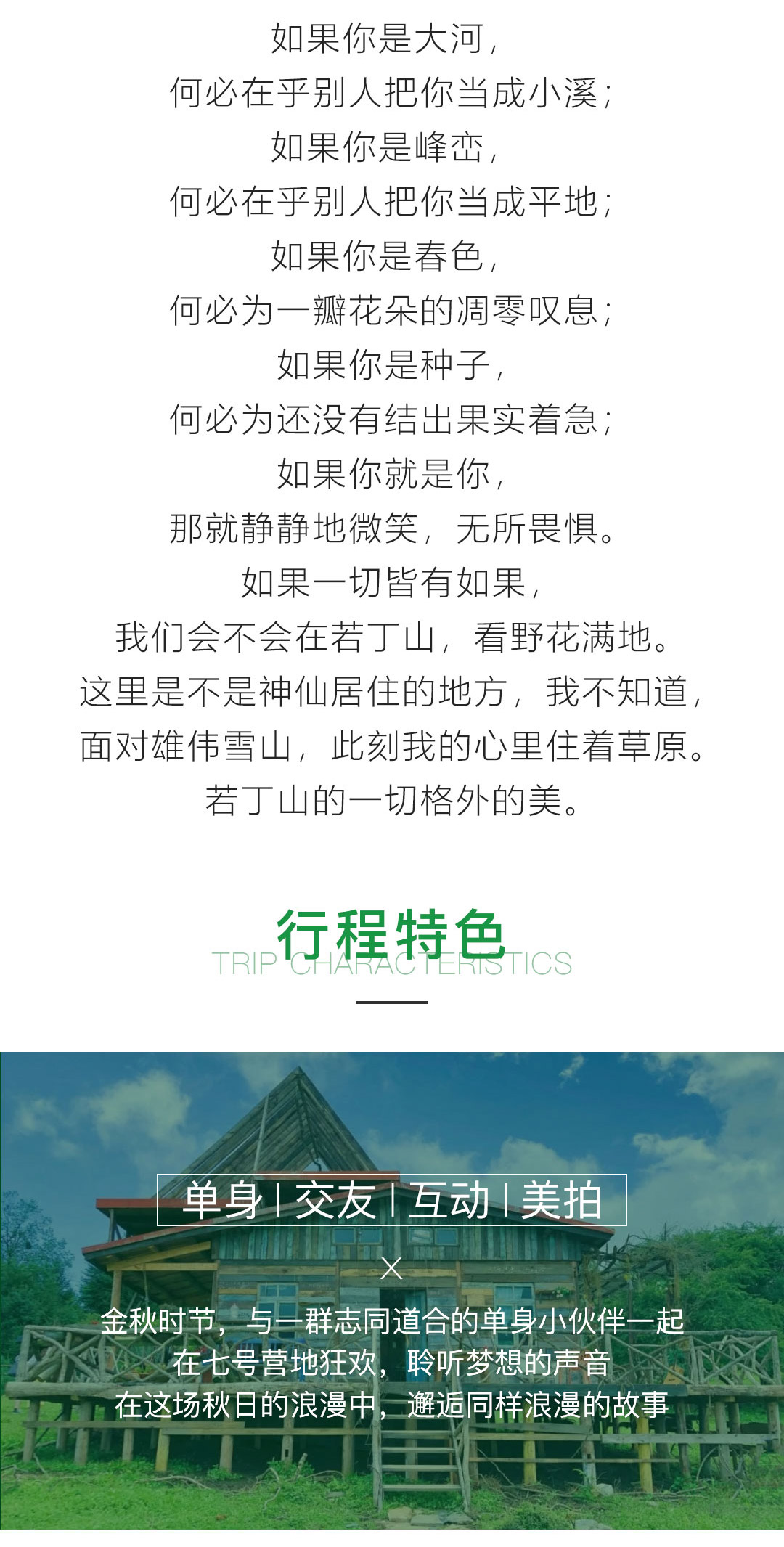 若丁山单身交友2日游 一场关于青春与梦想的旅行。无人不风景,无景不醉人。 从城市到远山,出发再回来,给平淡无奇的生活开一道缝隙,这缝隙里有青草和花香的气息。 其实,旅行不是济世良药,只是一片阿司匹林,只要你对一件事情像真爱般执着,你打动的,将是整个世界。 来若丁山吧!那个令无数人向往的世外桃源。景观亮点:世外桃源,精致酒吧,交友狂欢; 参团客群:18-35岁未婚单身男女; 团队人数:15人起成团,低于15人此团自动解散,所支付费用自动返回原账户; 集合解散:成都出发,成都散团; 特别告知:本产品全程纯玩无购物; 支付方式:在线支付+团上现付,详情请查看“费用包含”栏。