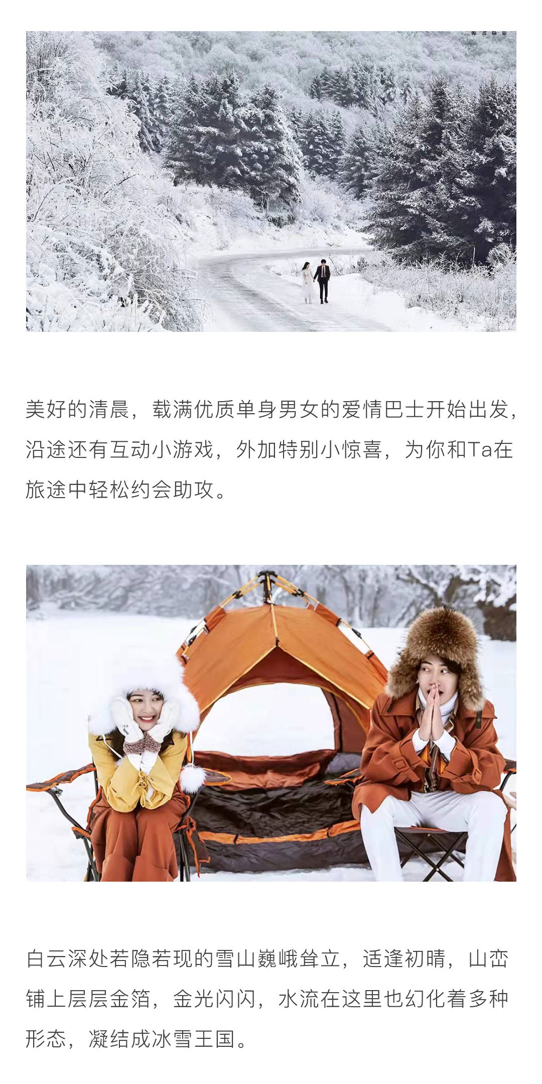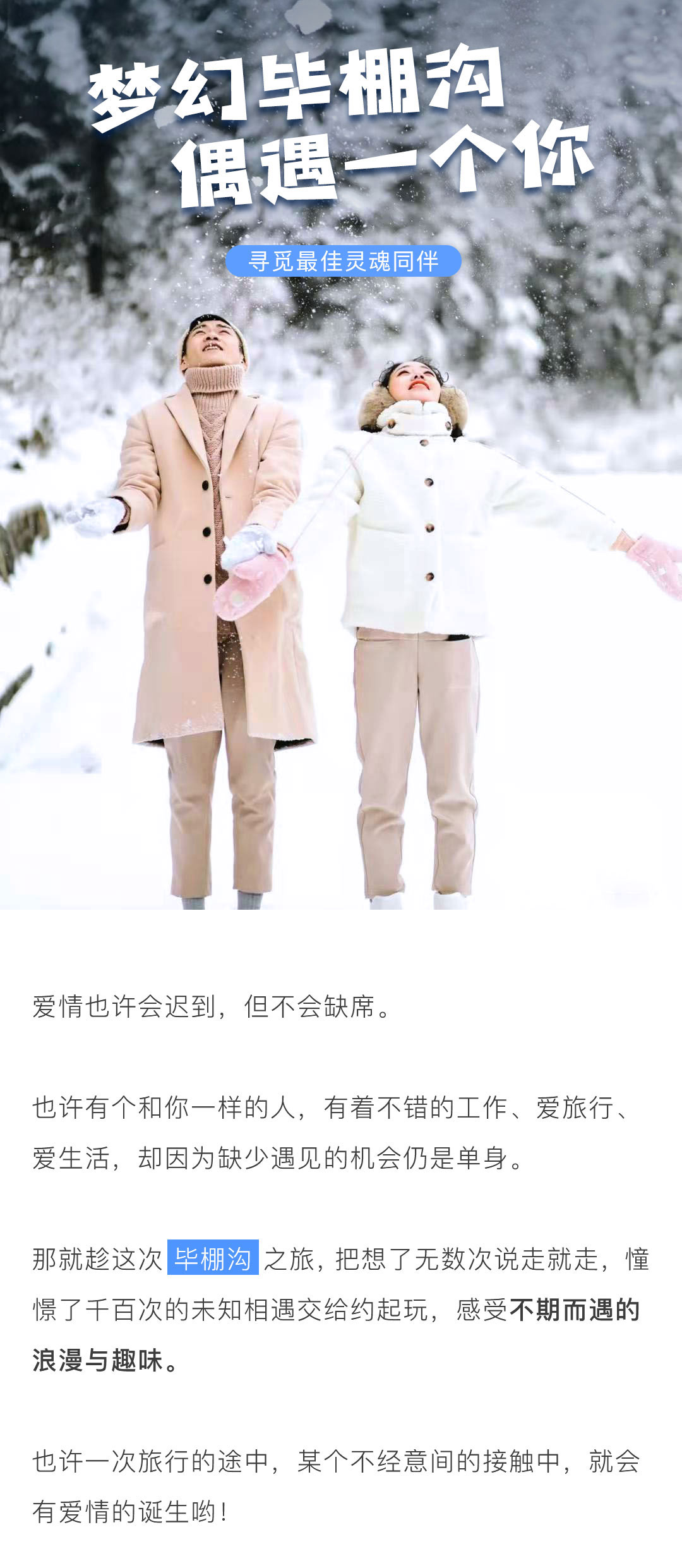 爱情也许会迟到,但不会缺席! 这个冬日,去毕棚沟看场雪吧!奔赴一场边走边爱的旅程,邂逅一个惊艳的冬,偶遇一场心动的意外。 旅行主题:单身旅行主题; 景观亮点:白雪皑皑,雪地撒欢,趣味游戏; 参团客群:18-38岁单身未婚者; 团队人数:20人起成团,低于20人此团自动解散,所支付费用自动返回原账户; 集合解散:成都出发,成都散团; 特别告知:本产品全程纯玩无购物; 支付方式:在线支付+团上现付,详情请查看“费用包含”栏。