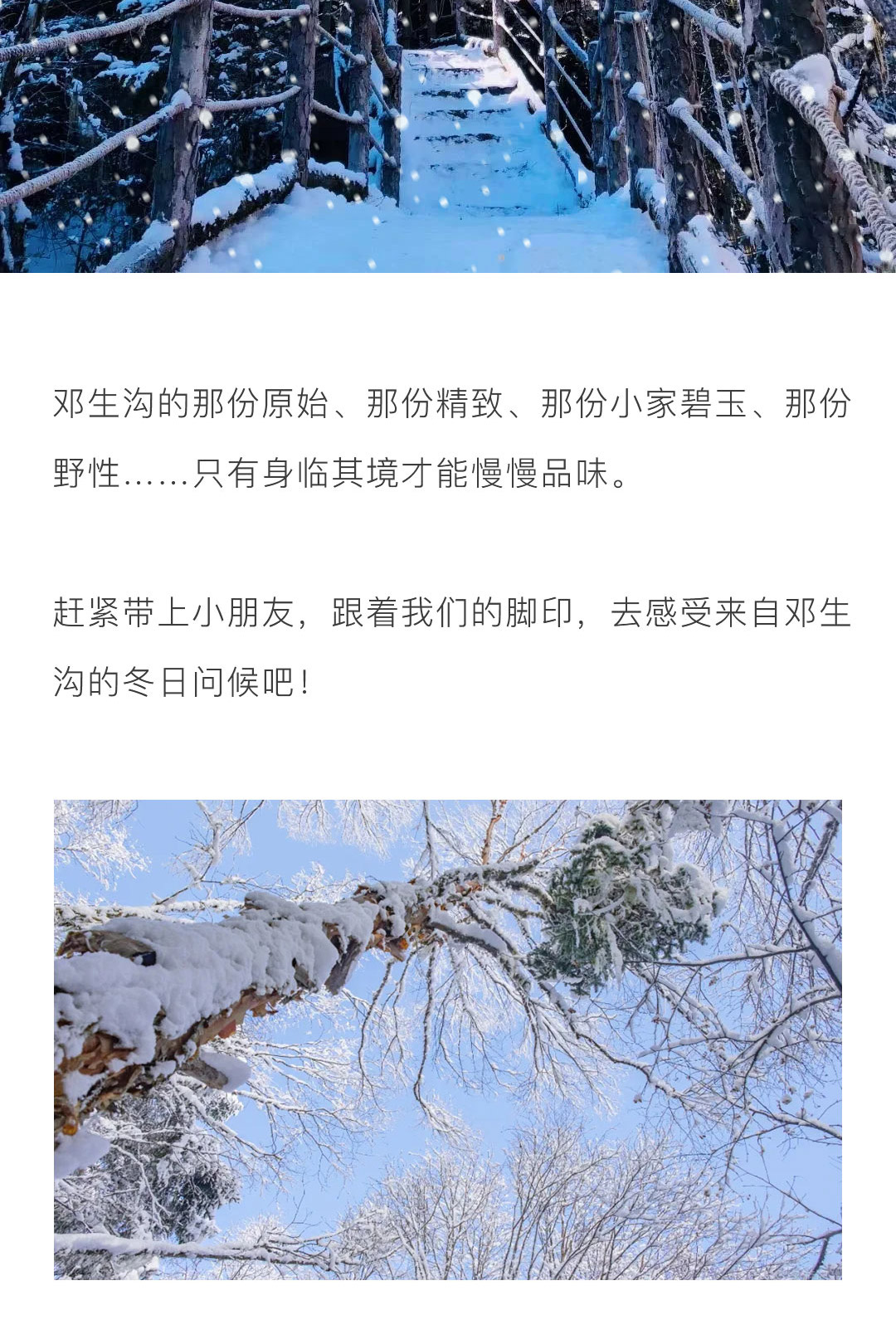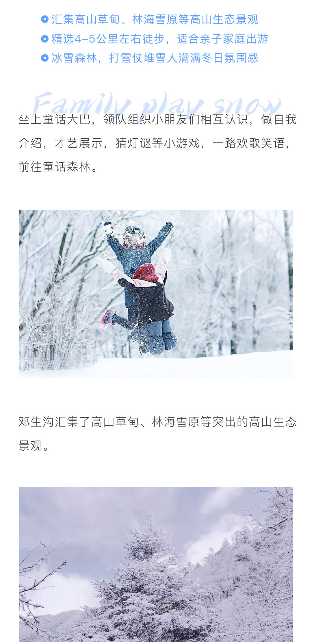 邓生沟的美,光靠照片和语言是无以言表的,那份原始、那份精致、那份小家碧玉、那份野性……只有带上小朋友们身临其境,才能慢慢品味。 旅行主题:亲子游主题; 景观亮点:童话森林,冰雪世界; 参团客群:4岁以上亲子家庭; 团队人数:12人起成团,低于12人此团自动解散,所支付费用自动返回原账户; 集合解散:成都出发,成都散团; 特别告知:本产品全程纯玩无购物; 支付方式:在线支付+团上现付,详情请查看“费用包含”栏。