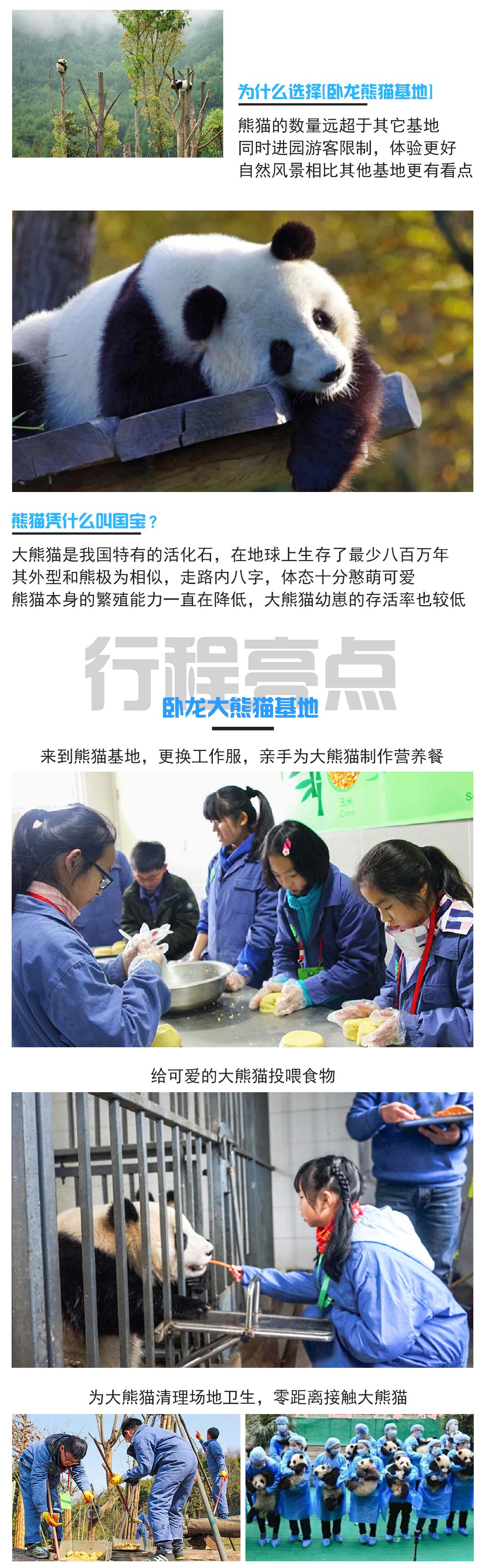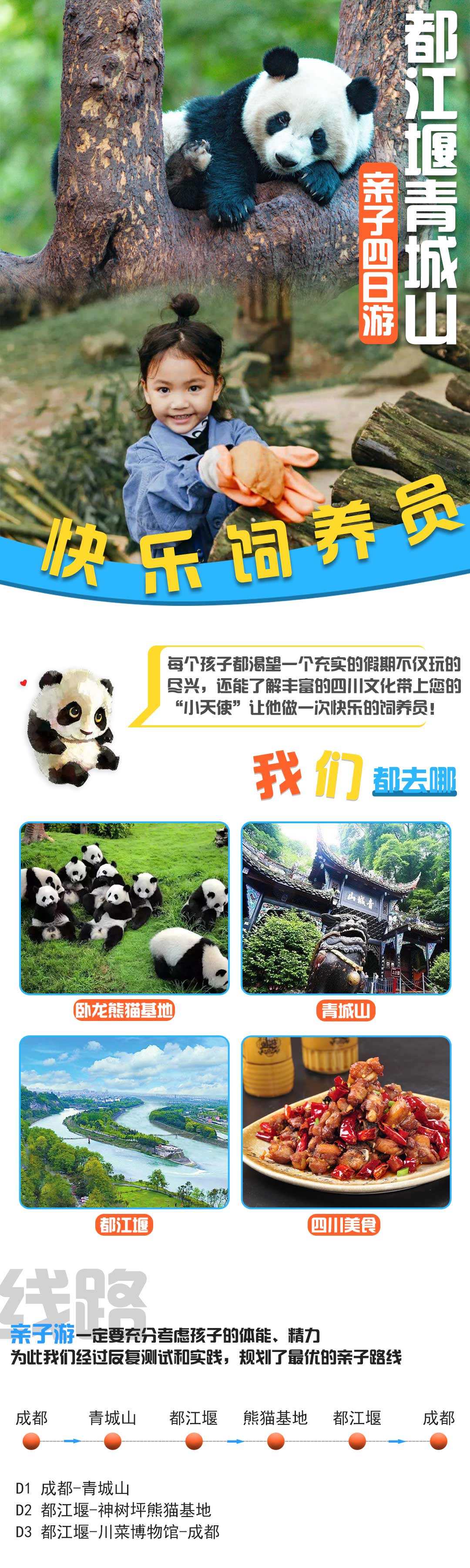 动物是人类的好朋友,熊猫是我们的国宝,每个小孩子都应该从小了解我们萌萌的国宝,学习熊猫科普课程,了解都江堰水利工程,观看川剧丰富川文化,学习川菜,泡温泉,问道青城山,丰富精彩的亲子游将给您和亲爱的孩子带来无限的美好回忆!