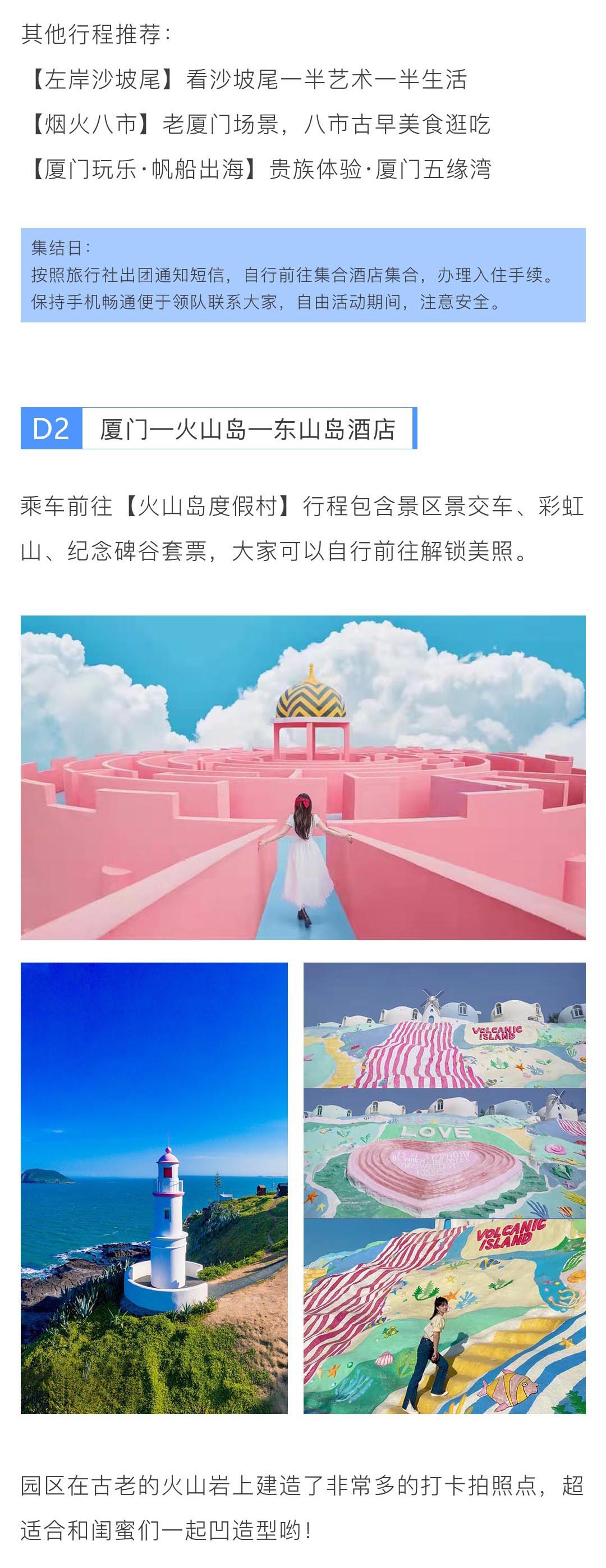 这是一趟蓝色的海岛之旅,意式风情彩色渔港和南国海滨落日余晖,绵延细腻的沙滩和玻璃蓝的海水,作为福建还算小众的优质海岛,是不可多得的新式度假首选地。 旅行主题:闺蜜游主题; 景观亮点:北欧风情、梦幻城堡、碧海蓝天; 参团客群:中青年户外旅游爱好者; 团队人数:4人起成团,低于4人此团自动解散,所支付费用自动返回原账户; 集合解散:厦门出发,厦门散团; 特别告知:本产品全程纯玩无购物; 支付方式:在线支付+团上现付,详情请查看“费用包含”栏。