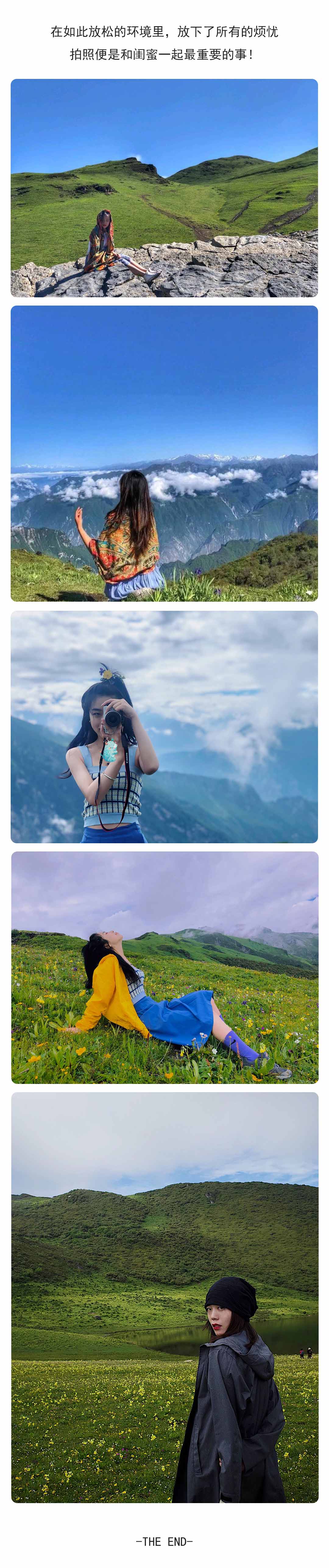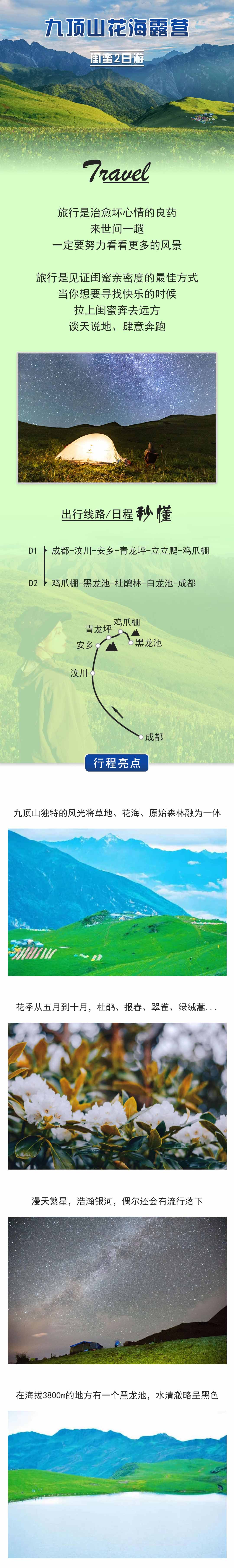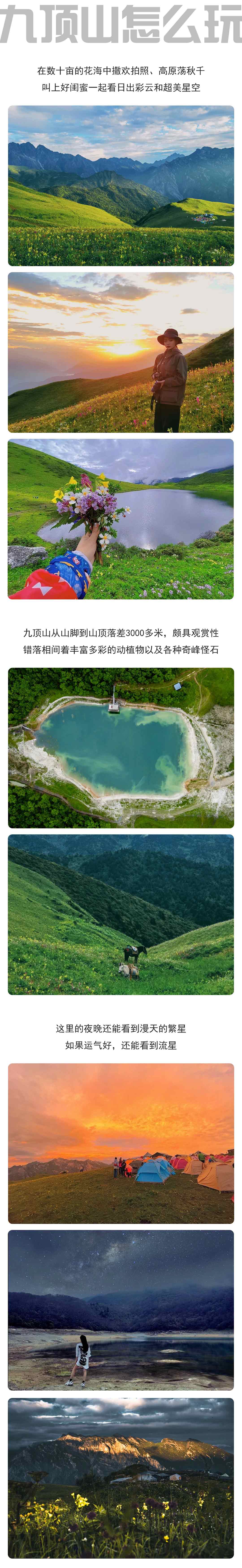 有没有一个地方适合闺蜜一起去玩?要求:时间短、路程近,有花海、有湖泊,能看云海、星空、雪山......这里就是九顶山!最适合闺蜜、小姐妹一起拍拍拍的地方! 九顶山花海是川西最富盛名的“空中花园”,每年夏季都是徒步者、赏花爱好者的出行首选! [产品性质]本产品适合18-39岁喜欢户外旅行的闺蜜、朋友参与拼团 [付款方式]线上支付+团上现付(详情查看“费用说明”栏) [成团须知]12人起成团 [行程亮点]草原花海、原始森林、高山湖泊 [集合解散]成都出发,成都散团 [特别告知]本产品属于户外徒步产品,真纯玩无购物。