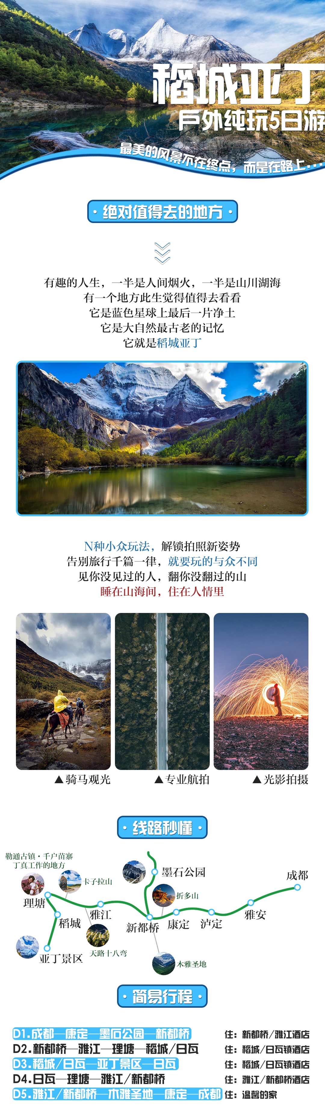 行程亮点:高原冰川、雪山,原始彩林,野生海子、草甸